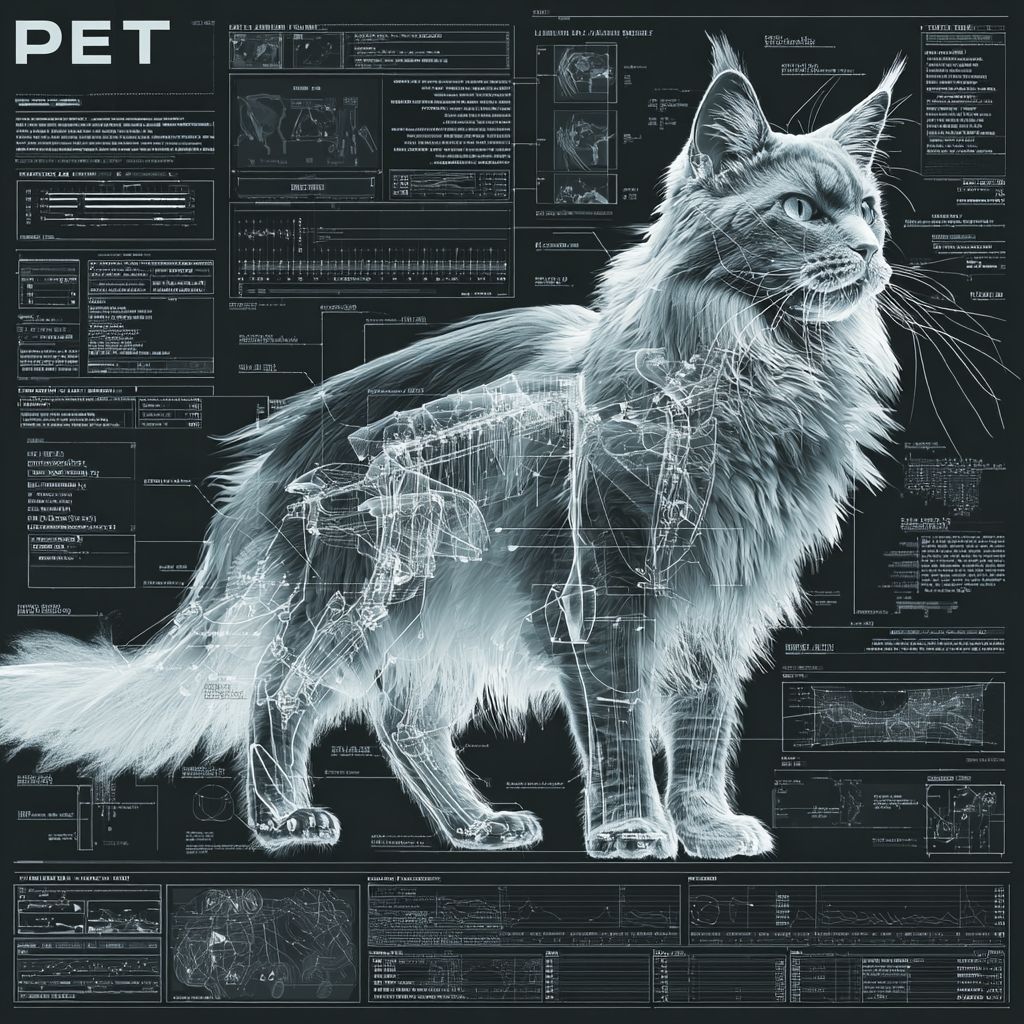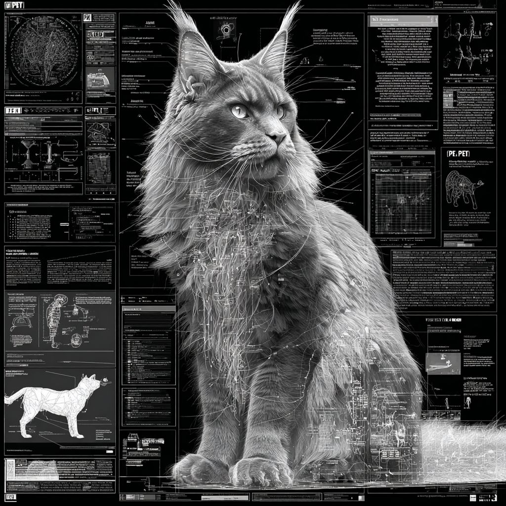 Огромный мейн-кун, изображенный в полупрозрачном черно-сером тоне. Кот сверкает, словно сделан из стекла или голографической проекции. Общий стиль сочетает в себе научную иллюстрацию и футуристическую визуализацию. Кот изображен не только эстетически, но и 'анатомически', с поперечными сечениями, диаграммами, линиями и числовыми знаками. Вокруг и рядом с котом находятся многочисленные текстовые поля, числовые коды, графики и метки. Они напоминают технические заметки, схемы структуры генов или интерфейс футуристической научной лаборатории. Каждый текстовый элемент состоит из слова 'ПЕТ.' Дополнительные детали включают котят, когти и зубы, каждая из которых сопровождается отдельными диаграммами и метками, как будто это часть графика исследований в области биоинженерии. Рядом с котом находится миниатюрная анатомическая карта кота, показывающая прозрачную собаку. Вокруг и рядом с птицей также много текстовых полей, числовых кодов, графиков и меток — это похоже на технические заметки, схемы структуры генов или интерфейсы футуристической лаборатории.
