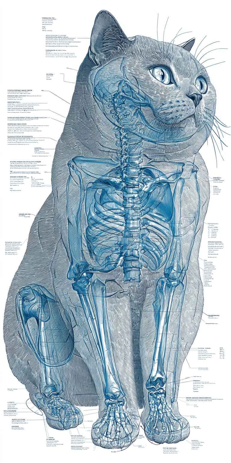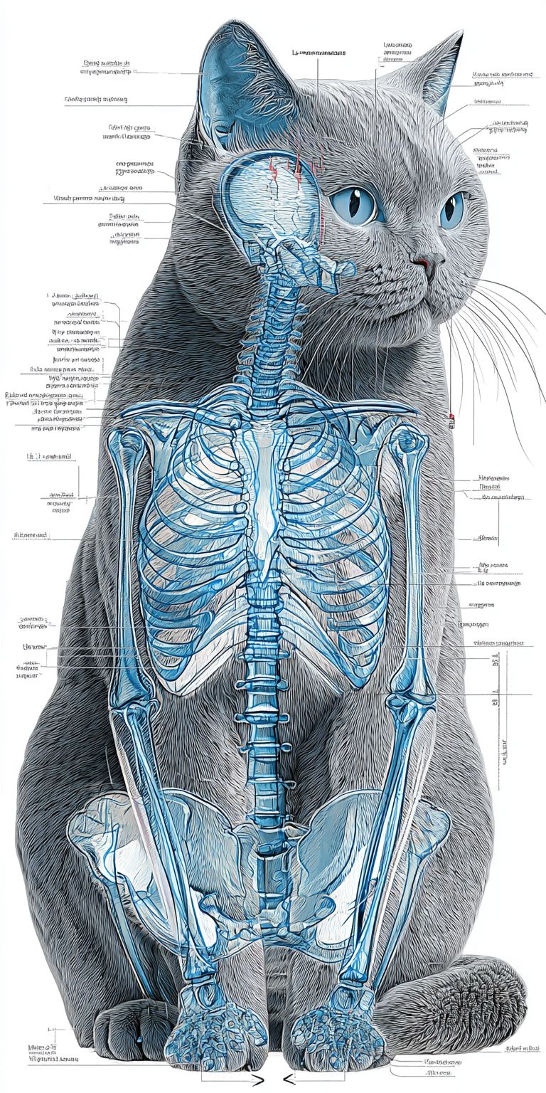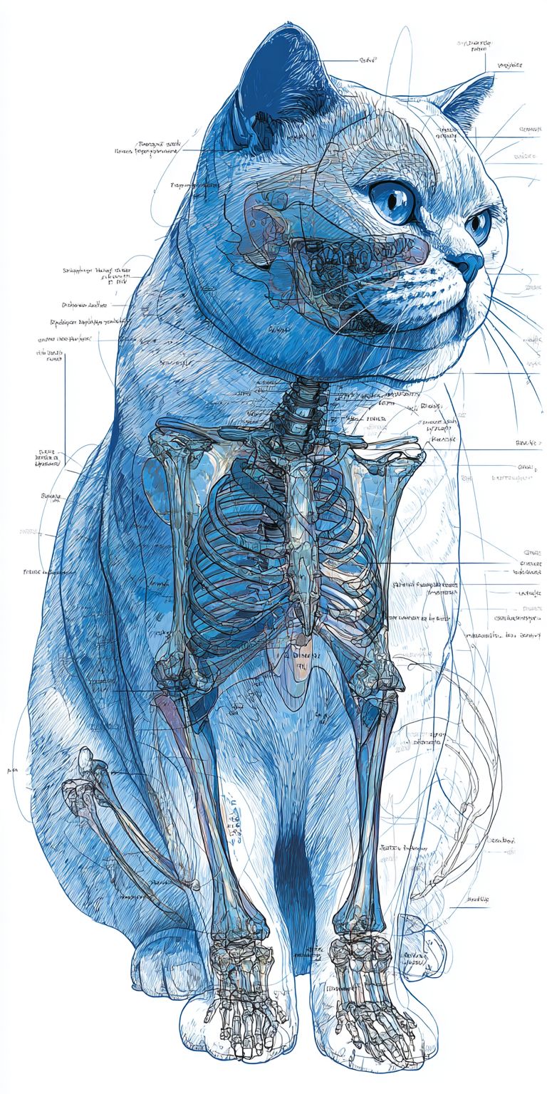 Инженерная анатомическая диаграмма британского короткошерстного кота с круглым лицом и густой голубовато-серой шерстью, полупрозрачная форма, показывающая полную внутреннюю скелетную структуру: округлая череп, короткий позвоночник, компактные конечности и хвост, с указателями и ветеринарными научными примечаниями, иллюстрация медицинского разреза, белый фон