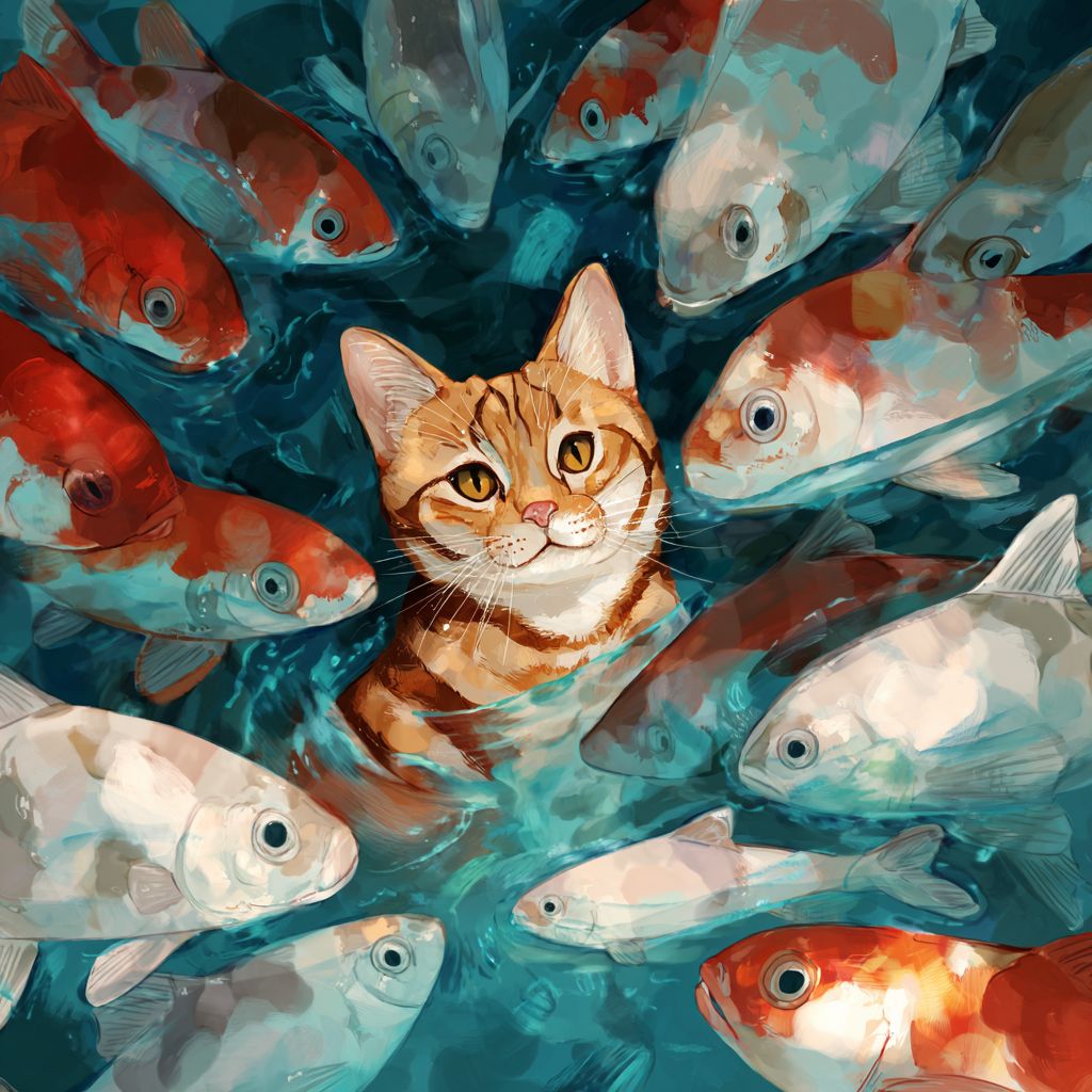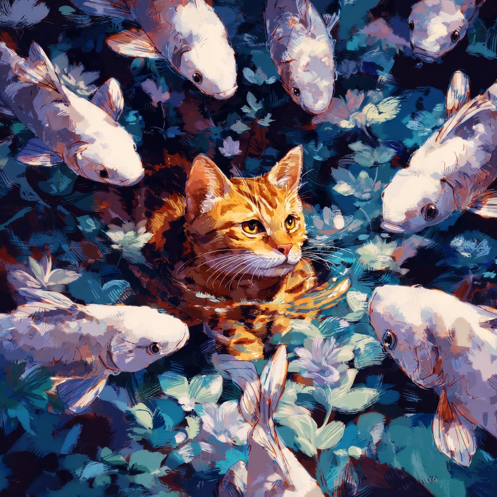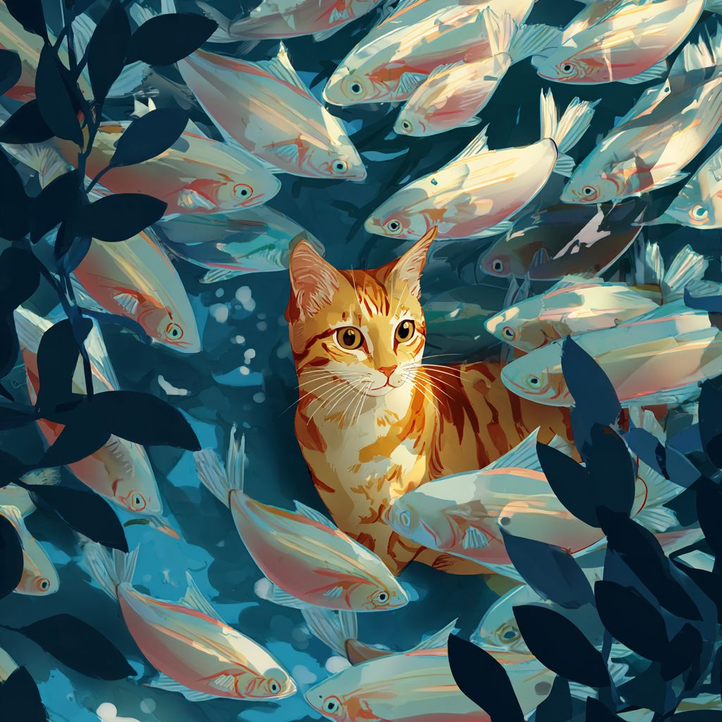 Кот прячется в синей воде, окруженный белыми рыбами. Иллюстрация, Гибли, оранжевый полосатый домашний кот, рыбы.