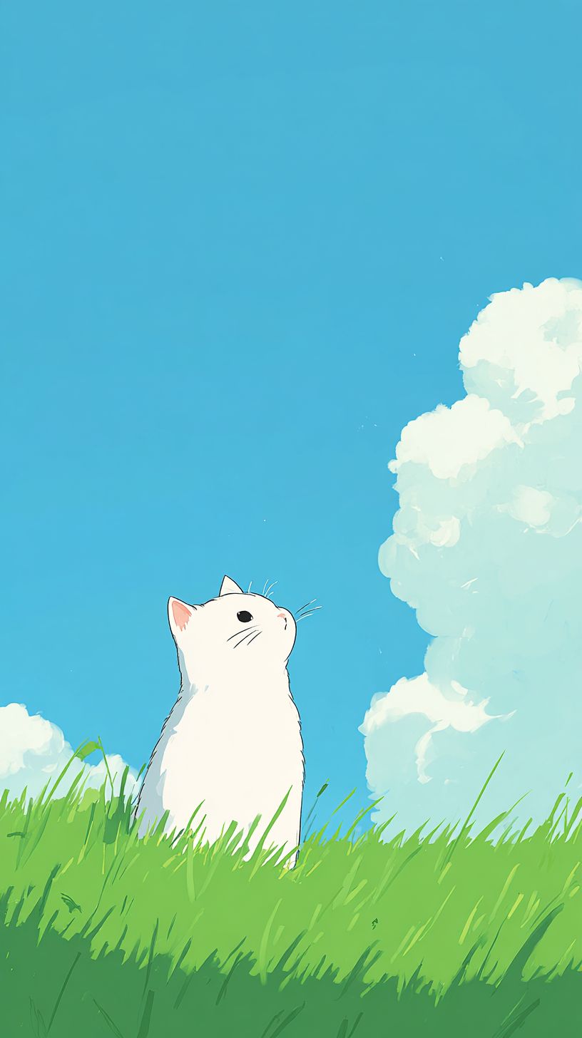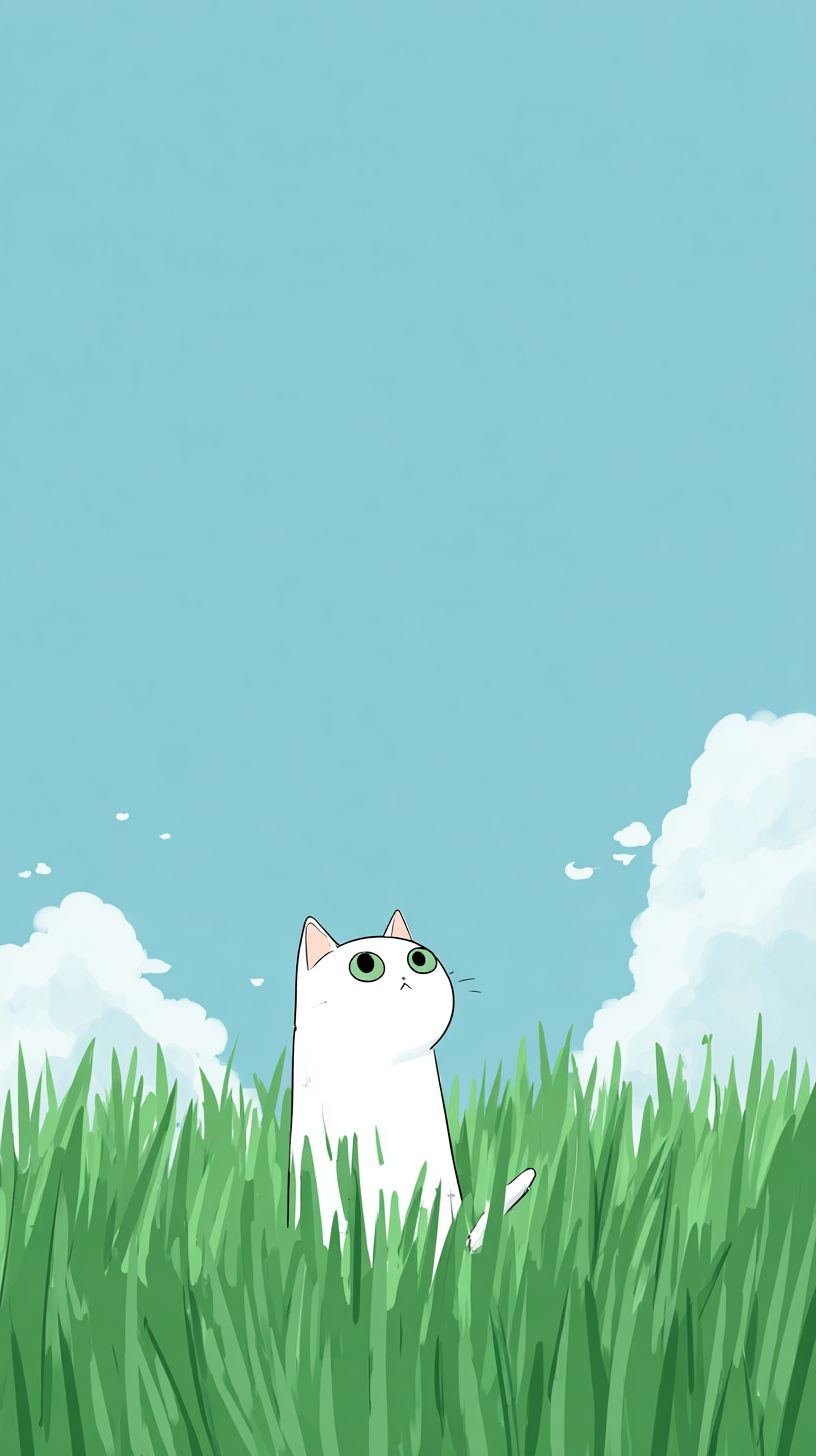 一幅数字插图,描绘了一只白猫在绿草地上,抬头望着天空,风格可爱,设计用于iPhone壁纸。